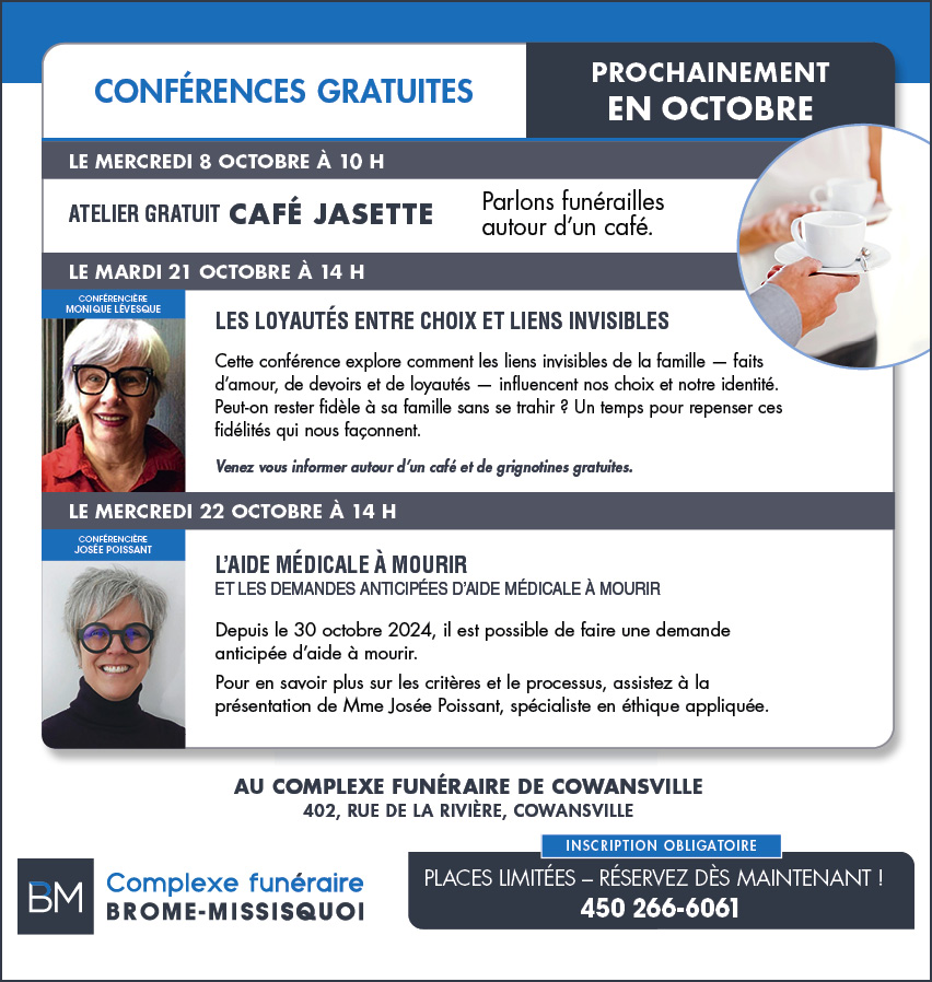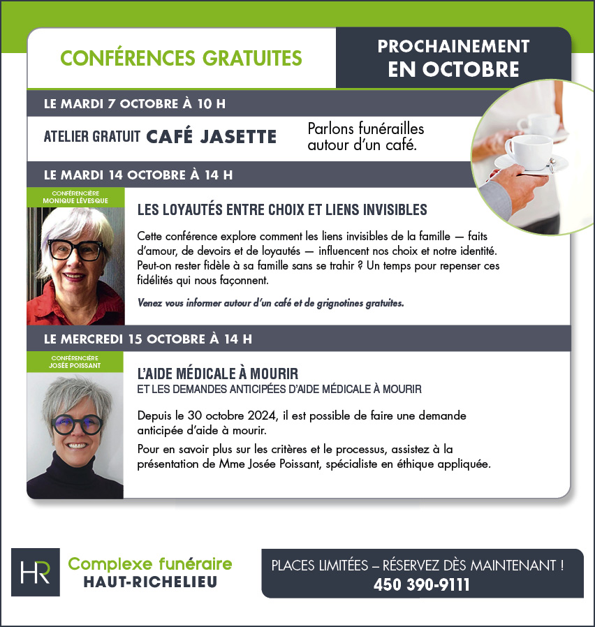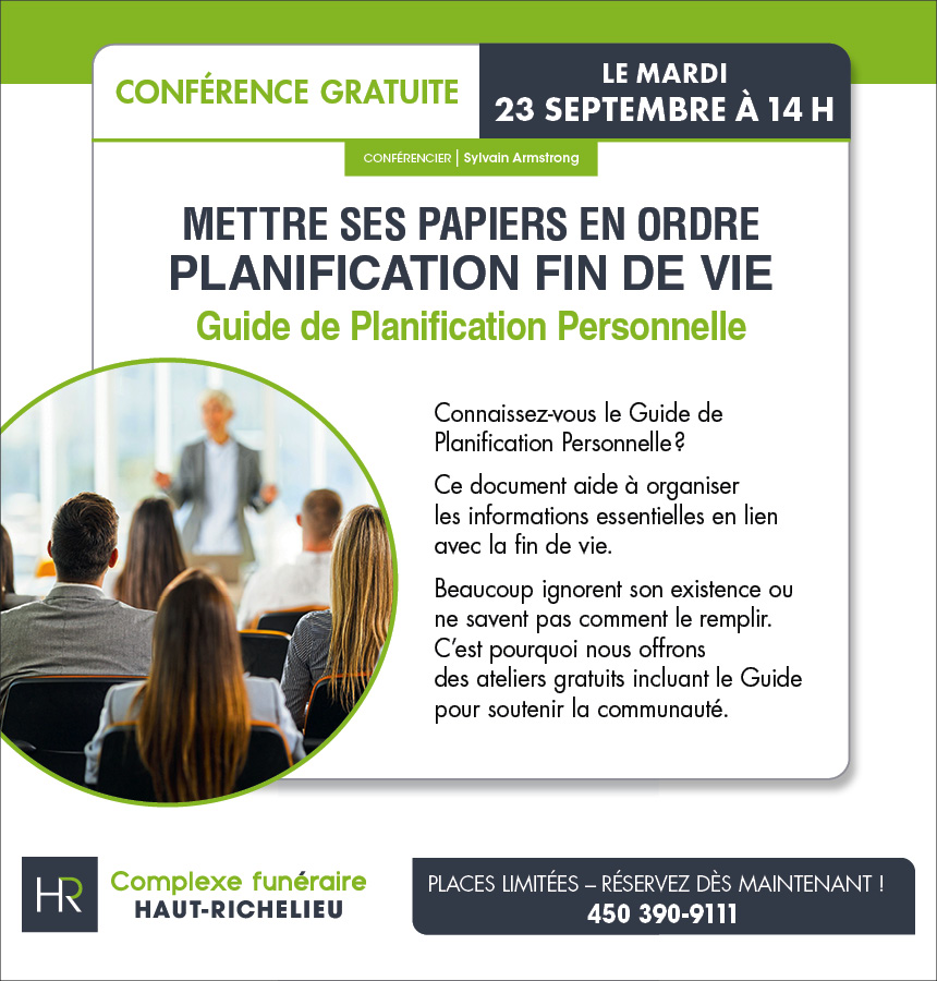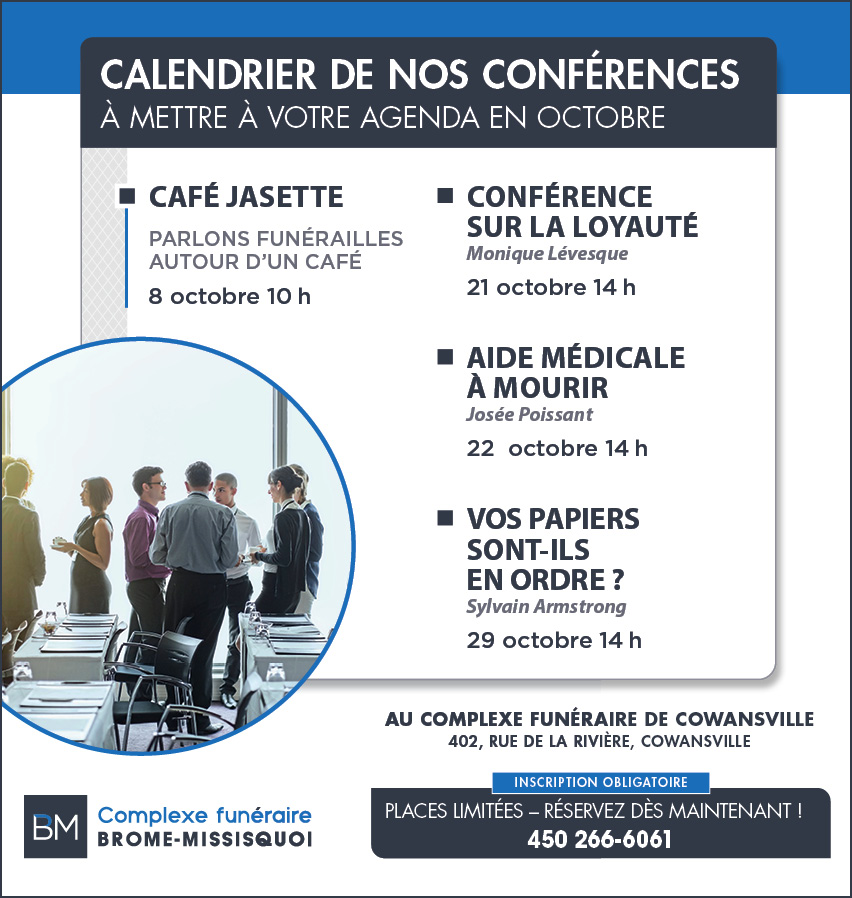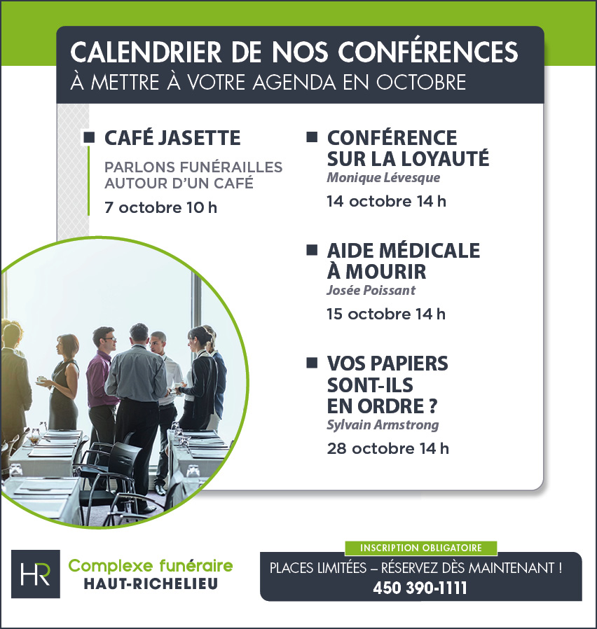 Notre babillard virtuel vous donne accès à une multitude de ressources en lien avec la planification funéraire, le deuil et les activités du Complexe Funéraire. Cliquez sur les évènements pour en savoir plus.